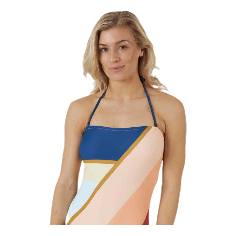 Yhden kappaleen Rip Curl auringonlaskujen lohko. Muoto on bandeau yhtenä kappaleena, mukava selkä, jota ylläpitävät 2 isoa elastista hihnaa ja silikonivuoraa. 84% polyamidi 16% elastaani